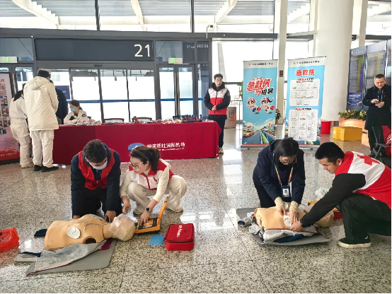 海曙区红十字会联合宁波机场集团有限公司开展 “爱心护航,救在身边” 春运主题活动,全力守护旅客出行安全。活动现场,红十字应急救护师为候机旅客讲解并指导心肺复苏、AED使用等急救技能,耐心解答应急救护相关疑问。红十字志愿者还提供检票指引、行李搬运、应急包扎等多样服务,用贴心举措缓解旅客出行焦虑,成为春运里温暖的 “红色坐标”。