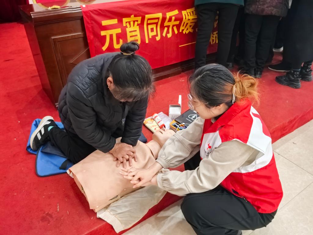 “手臂要伸直,用身体的力量向下压!”“01、02、03……记住这个节奏!”在文化礼堂内,红十字应急救护师郭金正在为居民演示心肺复苏的标准操作。她结合真实案例,用通俗易懂的语言,将看似复杂的心肺复苏术步骤一一拆解。从判断现场环境安全、检查患者意识到精准定位按压点、控制按压深度与频率,再到实施人工呼吸,每一个步骤都讲解得清晰透彻,示范得标准规范。