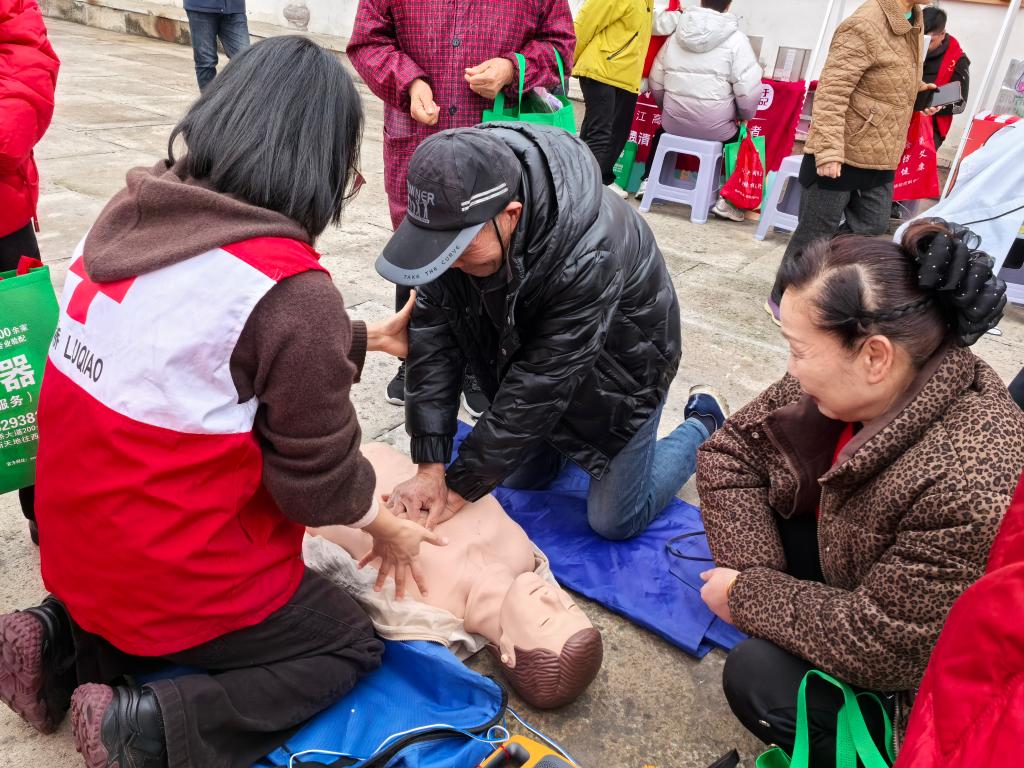 这里不同于传统的单向宣讲,更像一个开放式的“实训课堂”。“手臂要绷直,不能弯!”“对,就是这样,节奏再稳一点!”在红十字志愿者的指导下,大家亲身参与实践操作,逐步掌握心肺复苏的关键要点。一位刚完成实操的大姐擦着汗说:“以前只在电视上看过,今天亲手试了才知道,这真不是轻轻松松的事。学会这个,心里踏实多了!”在一次次操作和互动中,大家从“看懂”到“会做”,将应急救护技能真正“装进”心里。