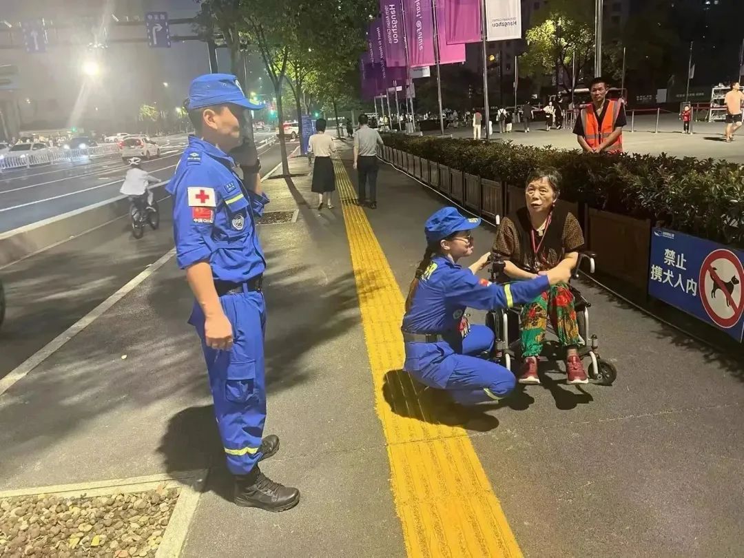 9月23日,开幕式举办当晚,钱江新城城市阳台周边人流量剧增。上城区红十字会组织红十字海豚应急救援队,在城市阳台开展应急保障志愿服务。救援队员们携带红十字便携式急救包,第一时间分流群众、引导人群、处置意外受伤群众19人次。直至当晚11点,城市阳台的人流逐渐离去,救援队员才结束任务。